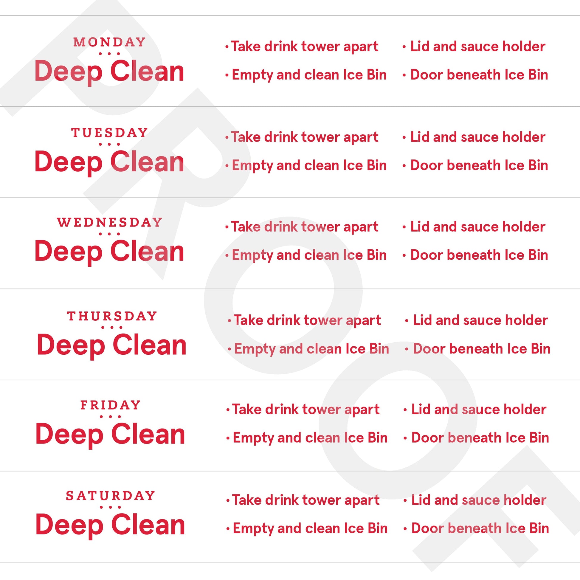 Adhesive sticker reminders to help your team know which station is deep cleaned which day. Pack includes (6) 2" x 18" stickers for everyday of the working week (M-Sat)
